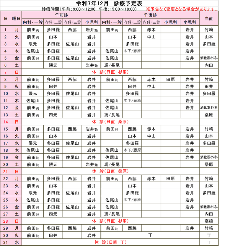 R7.12月診療予定表を公開しました
